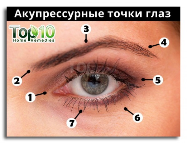 Вокруг глазных орбит (на костях вокруг глаз) расположены акупунктурные/акупрессурные точки.
